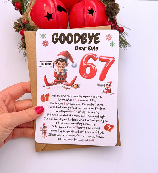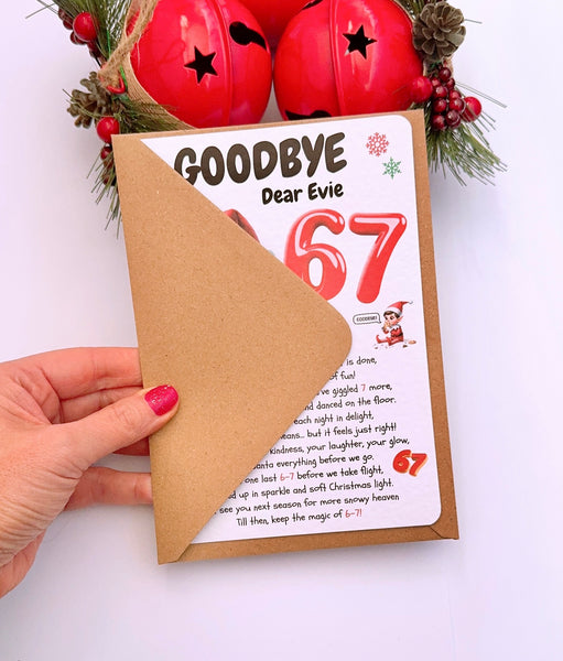 Say goodbye/farewell to the Elf/Elves in magical style with this “6-7 Mystery” goodbye letter, a fun and festive note. Printed on high-quality card and written in a playful rhyme, the mysterious phrase “6-7” adds a touch of North Pole wonder — no one knows what it means, but that’s half the fun!