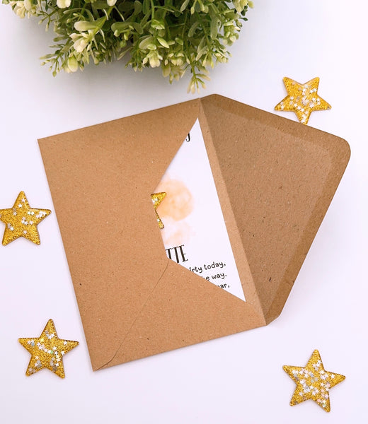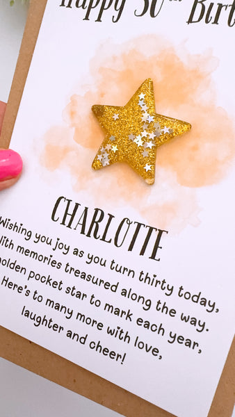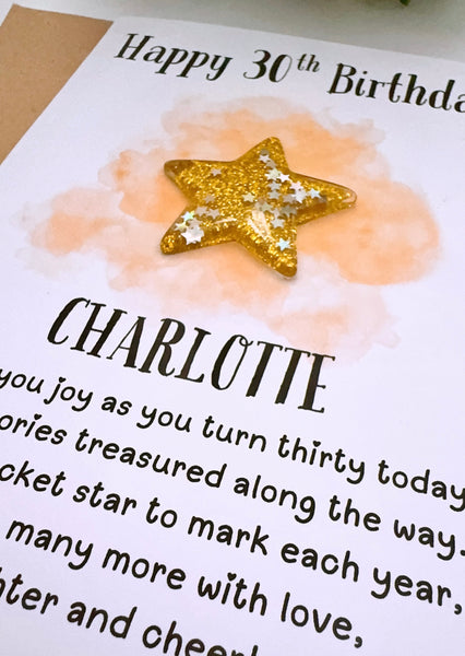A simple and meaningful way to celebrate a milestone. This personalised handmade birthday card can be customised with any age and comes with a resin gold lucky star charm attached — a lovely unique keepsake. The card is perfect for Milestone birthdays of any kind (16th, 18th, 21st, 30th, 40th, 50th, 60th, 70th, 80th). The card is a unique alternative to standard birthday cards