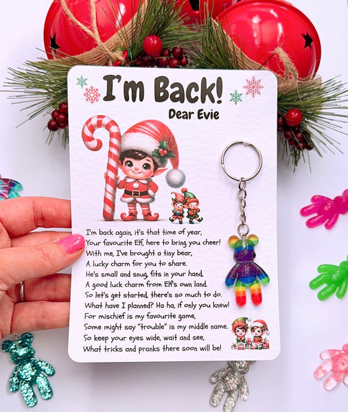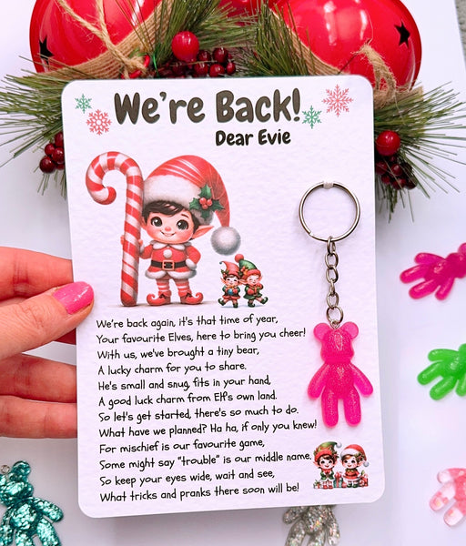 Welcome the naughty/cheeky Elf/Elves this Christmas with this cute letter and pocket keyring bear. The bear is designed to bring love and reassurance over the Christmas period. This gift makes the perfect unique elf arrival gift/present.